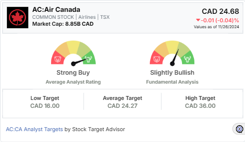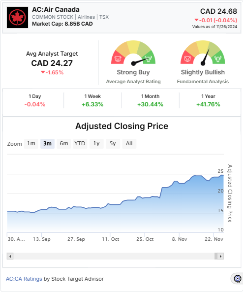 Stock Target Advisor gives Air Canada a Buy rating, with a target price of $24.65, representing a marginal projected price change of -0.12% in 12 months. They credit several positive signals for their rating, including superior capital utilization, superior earnings growth, and a remarkable high gross profit to asset ratio.