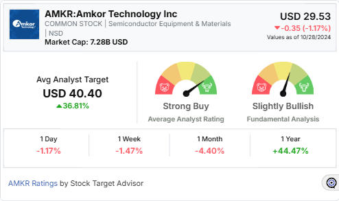 According to Stock Target Advisor’s analysis, Amkor Technology Inc. is forecasted to reach an average target price of USD 40.40 over the next 12 months, with a “Strong Buy” rating from analysts. The stock’s performance has been marked by a one-year capital gain of 44.47%, demonstrating solid growth in the semiconductor equipment and materials sector.