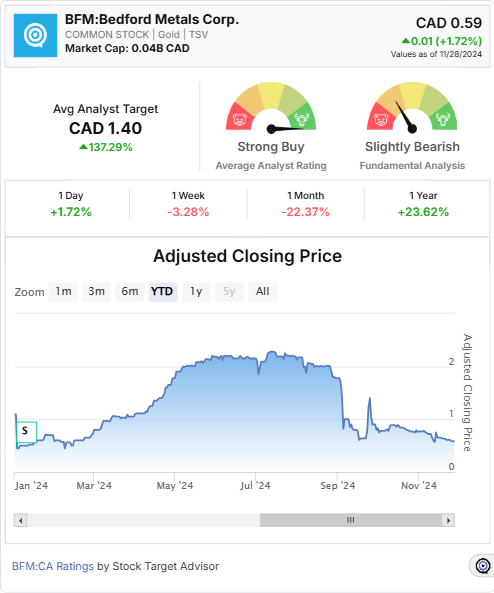 Stock Target Advisor currently rates Bedford Metals Corp’s stock as a ‘Sell’, setting a target price at CAD 1.40. This represents a potential price change of 137.29% in the next 12 months. Surprisingly, the Average Analyst Target Price also stands at CAD 1.40, indicating a consensus in market outlook.