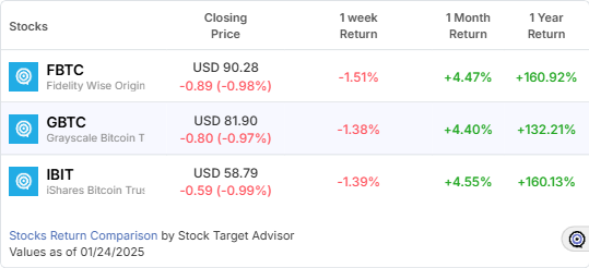 Here’s a curated list of top Bitcoin ETFs currently trading on the US stock market, along with insights into their performance and an analysis from Stock Target Advisor.
