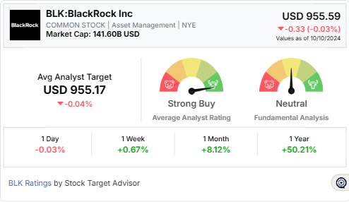According to Stock Target Advisor, BlackRock’s stock has a 12-month target price of $955.17, with a “Strong Buy” consensus from analysts. However, Stock Target Advisor’s own analysis presents a “Neutral” rating based on six positive and six negative signals. While the firm has a strong market position and solid financial health with positive cash flow and low debt levels, its current stock price is considered overpriced relative to earnings and free cash flow.