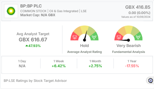 BP’s recent stock performance and market analysis paint a complex picture of the company’s future prospects. According to a stock analysis by Stock Target Advisor, BP PLC holds an average analyst target price of GBX 616.67, with an overall ‘Hold’ rating from analysts. However, Stock Target Advisor’s own analysis signals a ‘Very Bearish’ outlook for BP, based on several factors, including low revenue and dividend growth over the past five years.