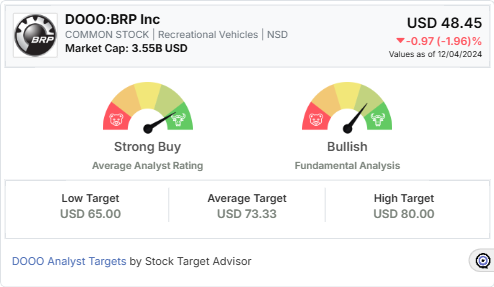 BRP Inc. currently holds a “Strong Buy” average analyst rating, with a target price of USD 73.33 over the next 12 months. Stock Target Advisor’s proprietary analysis forecasts a potential price increase of 59.96% within the same timeframe, presenting an optimistic outlook for the stock’s recovery.