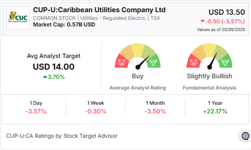 Caribbean Utilities Ltd has received a “Hold” rating from TD Securities, with a 12-month target price of USD 14.00. The company has an overall “Slightly Bullish” rating from Stock Target Advisor, based on 11 positive indicators and 6 negative indicators.