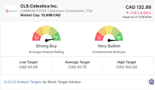 According to Stock Target Advisor, Celestica Inc earns a “Very Bullish” rating based on 16 positive signals and no negative signals. Analysts are optimistic, setting an average target price of CAD 81.75 for the next 12 months.