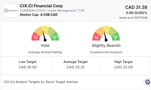 Analysts remain cautiously optimistic about CI Financial’s prospects. While the Stock Target Advisor’s consensus rating hovers around a “hold/outperform” status with some analysts projecting a one-year target of around CAD 25.