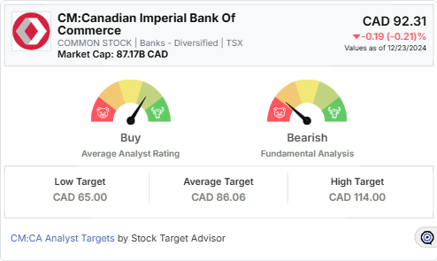 A snapshot of CM:CA reveals a sell rating by Stock Target Advisor with a projected price change of -4.09% in the next 12 months, benchmarking the target price at 88.53 CAD.
