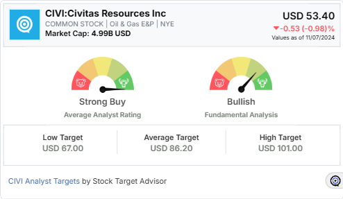 Stock Target Advisor’s analysis of Civitas is notably optimistic, rating it as a “Strong Buy” with a bullish outlook and a target price of $89.10, which reflects a 66.85% projected increase over the next year. Civitas has received an impressive average analyst target price of $86.20 from nine analysts, reinforcing market confidence in its long-term growth prospects.