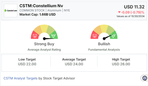 Constellium NV (CSTM) appears positioned for significant growth in the aluminum industry, with Stock Target Advisor forecasting a potential upside of 120.85% over the next 12 months, setting a target price of $25. This bullish projection aligns with the company’s robust foothold in the aluminum sector, specifically within the aerospace and automotive markets, which are key areas of anticipated growth for the company.