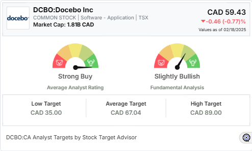 According to Stock Target Advisor, Docebo Inc. has an average analyst target price of CA$67.04 over the next 12 months and an average analyst rating of Strong Buy.