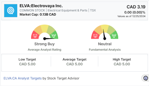 Stock Target Advisor gives Electrovaya a Neutral rating, citing a mix of positive and negative signals. The average analyst target price for the stock is CAD 5.00, with a strong buy recommendation from the sole covering analyst, highlighting long-term confidence despite short-term challenges.