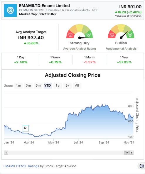 Emami Limited (EMAMILTD: NSE) is a stock worth considering for investors looking for a promising growth opportunity. According to Stock Target Advisor, the company has been rated as “Bullish,” with a target price of INR 950, reflecting a projected upside of 37.48% from its recent closing price of INR 691. Analysts have highlighted Emami’s robust financial health, demonstrated through positive cash flows and strong returns on assets, which bolster its appeal among sector peers.