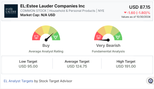 According to Stock Target Advisor, Estée Lauder’s stock outlook is Very Bearish with six negative indicators and no positive signals. The stock is currently priced at $87.15, reflecting a notable one-year drop of 60.29%. Despite a 12-month target price of $124.75 from analysts, Stock Target Advisor’s own projected price is $127.29, a potential rise, yet heavily contingent on stabilization in critical markets.
