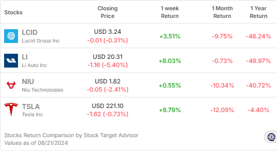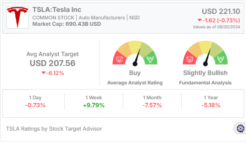 According to Stock Target Advisor, Tesla’s stock is currently rated as “Slightly Bullish,” with an average analyst target price of USD 207.56 over the next 12 months. Tesla’s stock price has shown significant volatility, with a recent closing price of USD 221.10. The stock has seen a 13.27% increase over the past week, but a decline of 18.10% over the past month. Over the last year, Tesla’s stock price has decreased by 5.18%.