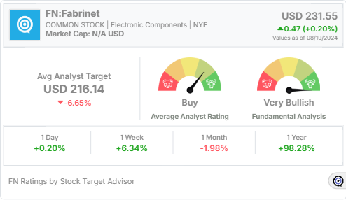 Stock Target Advisor’s analysis of Fabrinet paints a very bullish picture, highlighting three positive signals with no negative signals. According to the analysis, the average target price for Fabrinet over the next 12 months is $216.14, with a “Buy” rating from analysts. Notably, Fabrinet’s stock has seen a remarkable 98.28% increase over the past year, reflecting its superior risk-adjusted returns and top-quartile earnings and revenue growth compared to sector peers.
