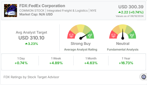 According to Stock Target Advisor, FedEx Corporation’s stock forecast is neutral. While analysts from Stock Target Advisor see a potential 1.66% decline over the next 12 months, other market analysts provide an average target price of $310.10, with a “Strong Buy” rating from 20 analysts.