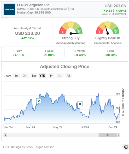 According to Stock Target Advisor, Ferguson Plc’s stock has a slightly bearish outlook despite its strong fundamentals. Analysts have set an average target price of $233.20 for Ferguson over the next 12 months, with a “Strong Buy” rating. However, Stock Target Advisor notes several negative signals, including high volatility, below-median total returns over the past five years, and overpriced valuations based on earnings, book value, and cash flow.