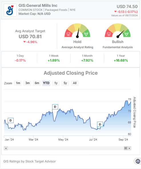According to Stock Target Advisor, General Mills is seen as a bullish investment, supported by three positive signals, which include superior risk-adjusted returns, high dividend yields, and strong dividend growth. However, the company’s below-median revenue growth presents a notable negative signal. At the last closing, General Mills’ stock price was $74.50, reflecting a slight weekly decline of 0.33% but demonstrating a stronger 5.47% increase over the past month and an impressive 13.08% gain over the past year.