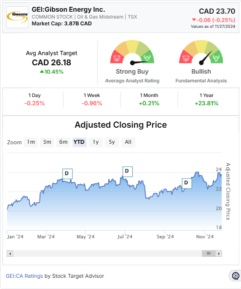 Gibson Energy Inc (GEI:CA) is emerging as a standout investment opportunity in the oil and gas midstream sector. With a robust outlook from Stock Target Advisor, which rates it as a “Strong Buy” and sets a 12-month target price of CAD 26.18, the stock offers promising growth potential. Currently trading at CAD 23.70, this represents an approximate 10.45% upside.