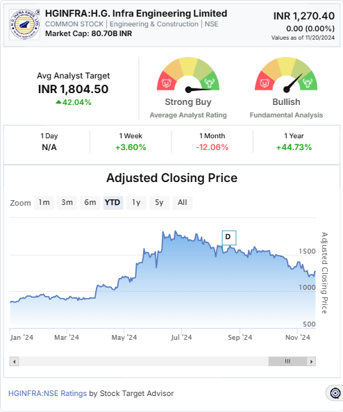 H.G. Infra Engineering Limited (HGINFRA: NSE) stands out as a compelling investment in the Engineering & Construction sector. Backed by robust fundamentals, the stock has received a “Strong Buy” rating from analysts, coupled with a bullish outlook from Stock Target Advisor. Here’s a closer look at the reasons behind this optimistic projection: