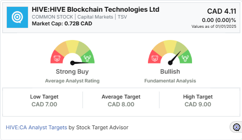 Stock Target Advisor rates HIVE as “Bullish,” based on eight positive signals versus three negative ones. Positives include its high market capitalization, superior revenue growth, strong return on equity, and consistent positive cash flows.
