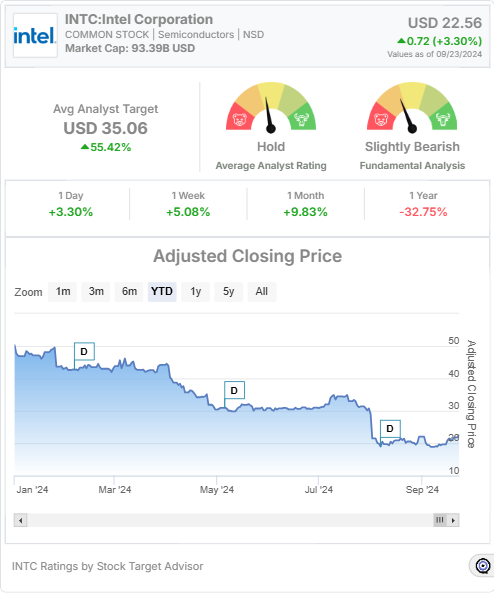 According to Stock Target Advisor’s analysis, Intel Corporation’s stock has a slightly bearish outlook. While Intel has displayed five positive signals, including its high market capitalization and positive free cash flow, it also faces eight negative signals, such as poor risk-adjusted returns and low revenue growth. The stock’s current price stands at USD 22.56, and despite the recent boost, Intel’s stock has seen a -34.21% decrease over the past year.