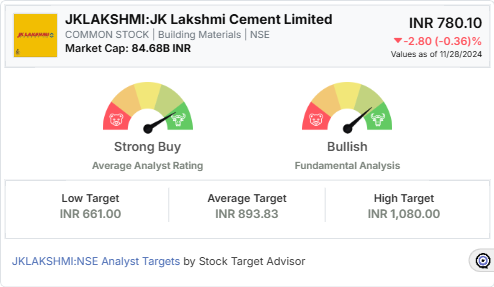 JK Lakshmi Cement Limited (JKLAKSHMI:NSE), a notable player in the Indian cement industry, has emerged as a strong investment prospect. According to Stock Target Advisor, the stock has received a “Strong Buy” rating from four analysts, with an average target price of INR 893.83. This reflects a potential upside of approximately 14.58% from the current price of INR 780.10, making it a compelling choice for investors seeking growth opportunities.