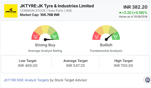 JK Tyre & Industries Limited (JKTYRE: NSE) has recently caught the attention of investors, with Stock Target Advisor indicating an average target price of INR 547.25 set by four covering analysts. This reflects a promising “Strong Buy” rating, positioning the stock as a potentially lucrative investment despite recent challenges. Currently trading at INR 382.20, JK Tyre presents an impressive upside potential of over 43%.
