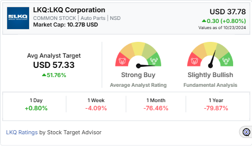 The average analyst target price for LKQ Corporation stands at USD 57.33 over the next 12 months, with a “Strong Buy” rating from analysts. At its last closing, LKQ’s stock price was USD 37.78, reflecting a substantial growth opportunity according to analysts’ projections.
