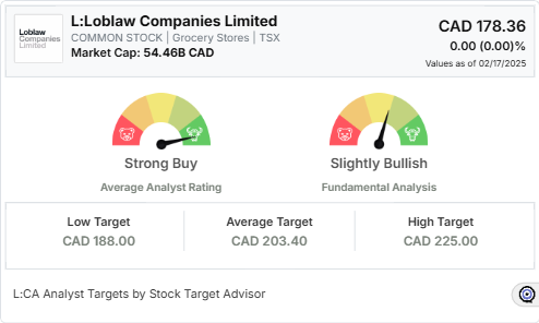 According to recent data from seven analysts, the average target price for Loblaw Companies Limited is CAD 203.40 over the next 12 months, with the average analyst rating at Strong Buy.