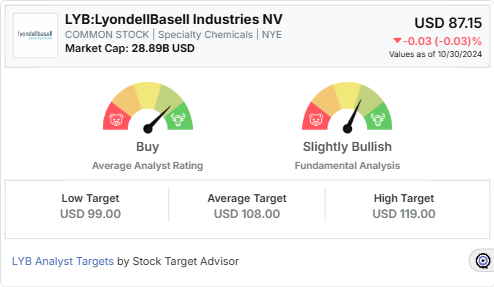 With LYB’s stock currently priced at $87.15, analysts have set an average 12-month target price of $108.00, reflecting optimism based on recent strategic moves. Major analysts, including Morgan Stanley and J.P. Morgan, rate the stock “Buy,” projecting target prices between $99 and $113.