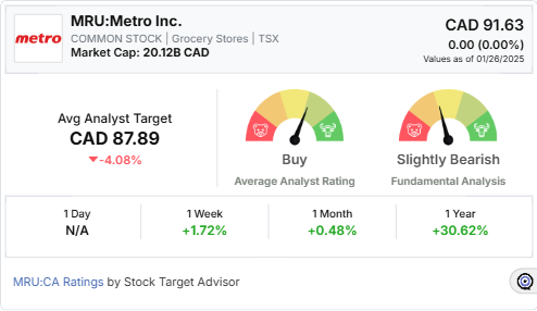 Stock Target Advisor has rated Metro Inc. as “Slightly Bearish,” citing a balance of 5 positive and 7 negative signals. Strengths include superior return on assets, strong cash flow generation, and top-quartile revenue growth in the past five years.