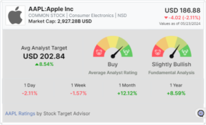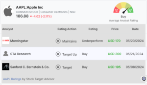 Apple Inc. (AAPL) has recently been evaluated by Morningstar, with a fair value estimate of $170.00 USD, while its last trading price was $192.35 USD on May 21, 2024. This suggests that the stock is currently trading above its fair value. The market capitalization of Apple stands at approximately $2.93 trillion USD, making it one of the largest companies globally. Morningstar (Analyst Rank #57) has assigned Apple a wide economic moat rating, indicating a strong competitive advantage, however the research company has maintained its “Underperform” rating for Apple’s stock.