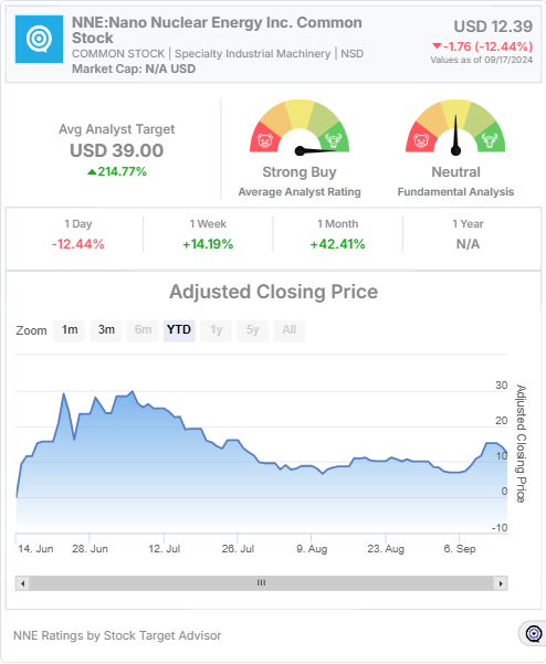 According to Stock Target Advisor’s analysis, Nano Nuclear Energy’s stock has been rated as “Neutral,” based on a balance of both positive and negative indicators. The company currently has no strong signals in either direction. Nano Nuclear Energy’s stock has shown a modest performance, with a 3.69% increase over the past month, but its one-year capital gain remains at 0%. The stock is currently trading below its 12-month target price of $39.00, as projected by analysts, who have given the stock a “Strong Buy” rating.