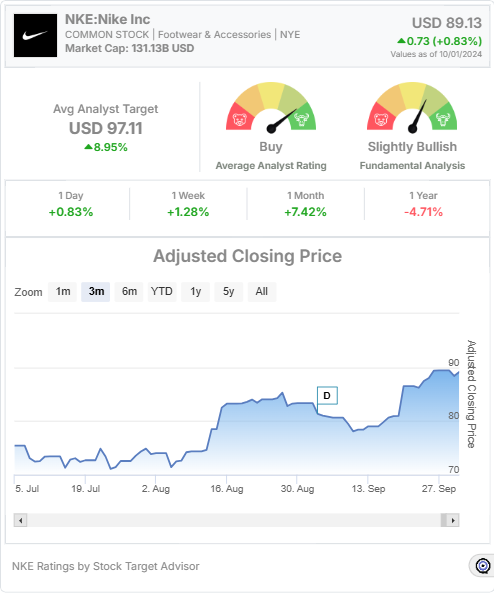 Stock Target Advisor maintains a slightly bullish stance on Nike Inc., based on a mix of positive and negative signals. Analysts have set an average target price of USD 97.11 for the next 12 months, with a current stock price of USD 89.13. Nike’s stock has experienced a positive change over the past month, but its one-year performance shows a decline of 6.27%.