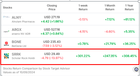 According to Stock Target Advisor, the outlook on SRRK is Very Bearish, driven by five negative signals, including the stock being overpriced compared to its book value and high leverage concerns. Despite these red flags, analysts maintain an average target price of $26.43 over the next 12 months, representing a possible 10.38% decline from its current value. However, the stock’s phenomenal recent performance suggests potential upside risks, especially if Apitegromab continues to progress smoothly.