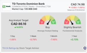 • Recent Stock Price: As of the last closing, TD Bank’s stock price was CAD 74.98. This provides a baseline for assessing the potential upside to the average target price of CAD 86.16.