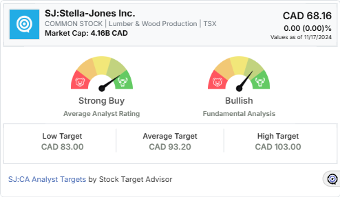Analysts remain bullish on Stella-Jones, assigning a strong buy rating with an average target price of CAD 93.20, representing a potential upside of approximately 36.7%. Despite recent market corrections, including a one-month decline of 21.19%, the stock’s long-term outlook remains optimistic. Its superior earnings and revenue growth metrics further enhance its attractiveness, albeit with caution advised regarding its higher price-to-earnings and price-to-cash flow ratios compared to peers.
