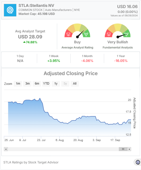 Stellantis NV (STLA) is one of the leading automotive manufacturers, known for its diverse portfolio of car brands, including Jeep, Chrysler, Fiat, and Peugeot. In this analysis, we will take an in-depth look at Stellantis’ recent stock performance, market conditions, and an analysis provided by Stock Target Advisor, including investor sentiment and analyst ratings.