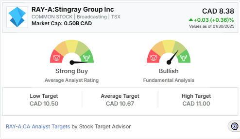 Stock Target Advisor currently rates Stingray Group (RAY-A: CA) as a “Buy,” with a target price of CAD 10.5, suggesting a projected price change of 25.3% in the next 12 months. This target is slightly below the average analyst target price of CAD 10.67, which indicates a “Strong Buy” consensus among analysts. Stingray’s stock closed at CAD 8.38 as of the last trading session.
