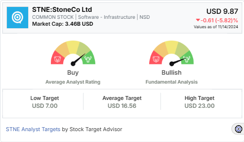 StoneCo’s integration of AI technologies enhances its operational efficiencies, enabling streamlined customer engagement and competitive differentiation. These advancements have earned it a “Bullish” rating from Stock Target Advisor, supported by seven positive signals and only one negative signal. Notably, analysts’ average 12-month target price of $16.56 reflects strong confidence in its growth trajectory.