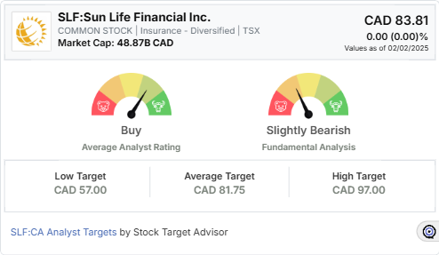 Other notable analysts covering Sun Life include Barclays, which has assigned a target price of CAD 87, and Scotia Capital, which maintains a Buy rating with a target of CAD 96.