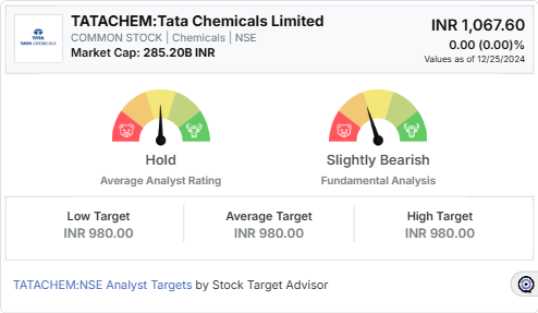 Stock Target Advisor rates Tata Chemicals as “Slightly Bearish,” citing four positive signals such as high market capitalization, positive cash flows, and superior dividend growth, offset by six negative indicators like high volatility, below-median return on assets, and poor earnings growth over the past five years.