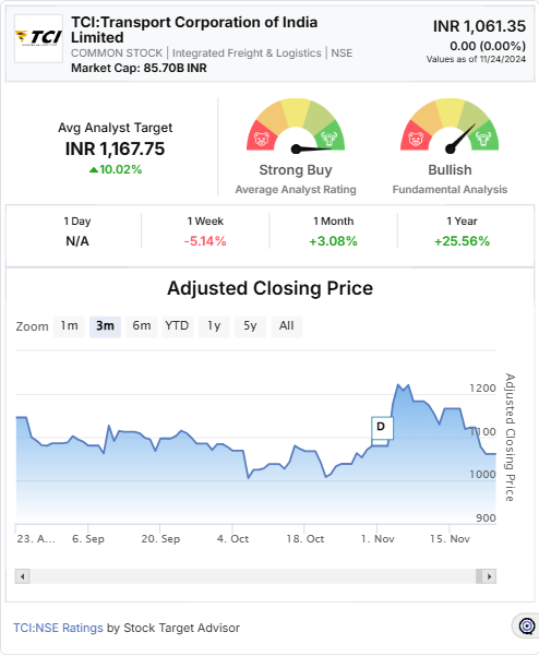 Transport Corporation of India Limited (TCI: NSE) has emerged as a standout pick in the Integrated Freight & Logistics sector. With a current price of INR 1,061.35, the stock boasts an average target price of INR 1,167.75 as per four analysts, reflecting a potential upside of over 10%. TCI’s strong market position is reinforced by a “Strong Buy” consensus rating and bullish indicators highlighted by Stock Target Advisor.
