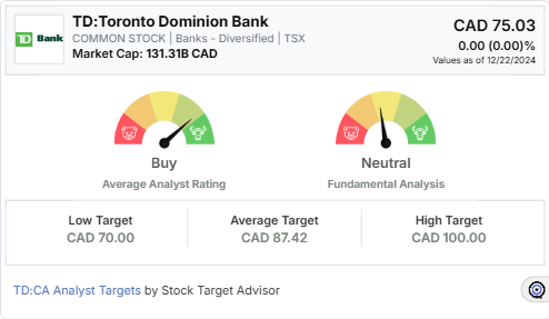 From an analytical perspective, Stock Target Advisor’s assessment of TD reflects a “Strong Sell” rating. With a 12-month target price of $64, it suggests a projected price change of 22.49%. This stands opposed to the average analyst target price, deemed to be $68.33 over the next year, with an overarching “Strong Buy” rating.
