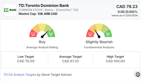 With a target price set by Stock Target Advisor at CAD 89.5, which is notably higher than the average analyst target price of CAD 87.32, TD:CA appears to face a projected price change of 12.96% in the next 12 months. Despite the potential, the bank’s stock has received a Stock Target Advisor’s rating of “Sell”.