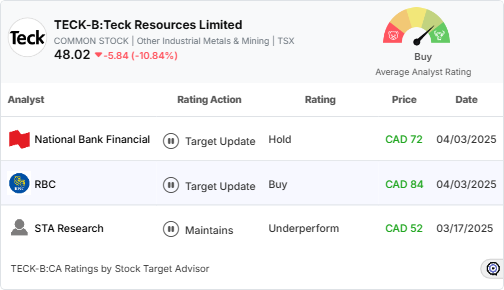 Analysts present a mixed outlook, with some rating Teck favorably despite trade uncertainties, while others signal caution due to tariff risks.