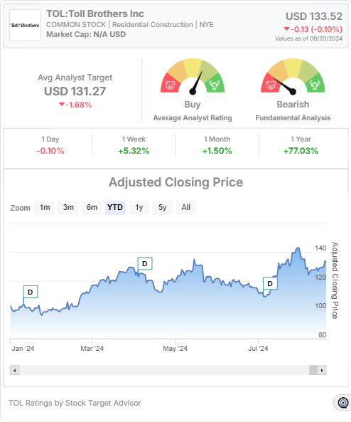 According to Stock Target Advisor, the average analyst target price for Toll Brothers Inc. is $131.27 over the next 12 months, with an overall analyst rating of “Buy.” However, Stock Target Advisor’s own analysis is “Bearish,” based on one positive signal and four negative signals. The stock has shown strong performance in the past year, with a 75.87% increase in its stock price, but it also exhibits high volatility, making it a risky investment for some investors.