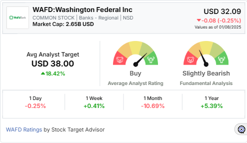Stock Target Advisor rates WaFd as Slightly Bearish, supported by 4 positive signals such as strong cash flows and gross profit-to-asset ratios, and 7 negative signals, including low revenue and earnings growth over the last five years. The service projects a 15.3% price change over the next 12 months with a target price of USD 37.