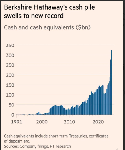 Berkshire Hathaway’s cash reserves surged to a record $325.2 billion, largely due to Buffett’s strategy of selling shares in companies like Apple and Bank of America while halting share buybacks.